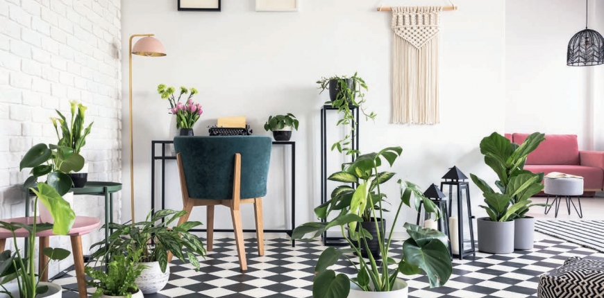 Aby rośliny mogły swobodnie rosnąć, należy zapewnić im dużo naturalnego światła. Istotna część trendu biofilii to otwarcie mieszkań i domów na światło, a zarazem otoczenie poprzez tradycyjne okna, ale też nietypowe przeszklenia. Dodatkowym atutem dużych okien jest również to, że wizualnie łączą one ogród z częścią mieszkalną, pozwalając na wnikanie zieleni do wnętrz. Żywe okazy roślinne można dzisiaj wprowadzać do pomieszczeń na wiele sposobów – kwiaty doniczkowe mogą jak dawniej wypełniać parapety, ale też swobodnie stać w olbrzymich donicach na podłodze, zwisać z sufitu, piąć się po ścianach pomieszczeń i ściankach ustawionych jako podpory. Czy powinniśmy im jednak pozwolić na ekspansję bez ograniczeń? Jak wdrażać zieleń do wnętrz, by zachowała swój walor dekoracyjny, ale by zarazem nie zdominowała naszego życia? Zwróćmy uwagę, że trend biofilia nie zachęca do wprowadzania roślin bez ograniczeń. Bycie częścią dżungli jest tylko wtedy korzystne, jeśli roślinność jest stosowana z umiarem i nie ogranicza funkcjonalności mieszkania. We wnętrzu warto wyznaczyć im jedno miejsce – do łask wracają kwietniki i meble tak skonstruowane, by w całości mogły wypełniać je donice z kwiatami. Stosujmy też zasadę trzymania się proporcji wielkości rośliny do powierzchni i wysokości wnętrza – na wyjątkowo okazałe okazy będziemy mogli sobie pozwolić w bardzo dużych i wysokich wnętrzach, w małych mieszkaniach ograniczmy się do gatunków, którym wystarczą małe doniczki.