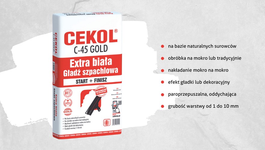 Biała masa szpachlowa do ścian CEKOL C-45 Gold to wybór idealny zarówno na start, jak i na finisz. To doskonały produkt pozwalający uzyskać gładki lub dekoracyjny efekt. To także synonim misji, jaką postawiła przed sobą marka CEKOL – pamiętania o tradycji, która jest fundamentem wszystkich dobrze przemyślanych działań, ale i otwierania się na nowe rzeczy i technologie. Ale przede wszystkim - na potrzeby klientów! CEKOL C-45 Gold to gładź szpachlowa bezpyłowa, która zachwyci więc zarówno znających nas, jak i nowych użytkowników.