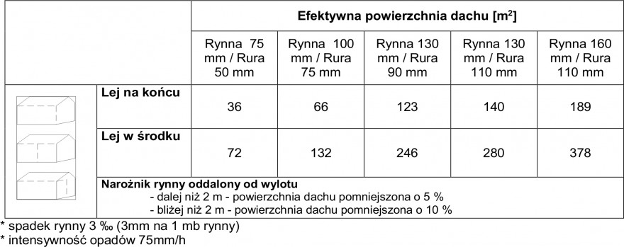 Aby dobrać odpowiedni system rynnowy z danej powierzchni dachu, należy wziąć pod uwagę następujące czynniki: efektywną powierzchnię dachu, z której ma być odprowadzona woda deszczowa, przepustowość rynny, rozmieszczenie lejów spustowych i ich odległość od narożników.