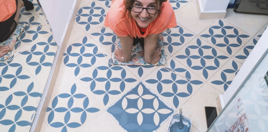 Arabeski i ornamenty to wzory zarówno jednoelementowe, jak i bardzo skomplikowane. W przypadku niewielkich pomieszczeń warto wybrać prosty wzór graficzny. Należy do nich prezentowany w aranżacji motyw łezki układający się w regularnie powtarzające się kwiaty, który możemy wykonać za pomocą gotowych szablonów malarskich. Styl marokański to też kolor – farby w odcieniach szarości i błękitów są jak najbardziej odpowiednie. Zanim przystąpimy do malowania, przygotujmy podłoże. Posadzka musi być równa, czysta i odtłuszczona – trzeba wyszorować płytki i fugi. Błyszczące płytki trzeba będzie zmatowić przy pomocy papieru ściernego. Zagruntowanie podłogi przed malowaniem poprawi przyczepność podłoża i podniesie trwałość okładziny