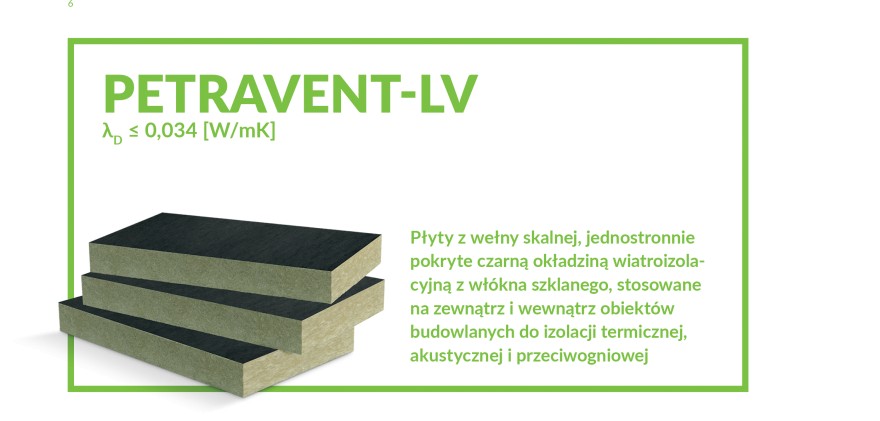 PETRAVENT-LV, PETRAVENT-V, PETRAVENT-HV – to grupa produktów stworzonych z myślą o elewacjach wentylowanych, których wspólnym mianownikiem jest jednostronne pokrycie czarną okładziną wiatroizolacyjną z włókna szklanego. PETRAVENT-LV to produkt o najniższej gęstości oferujący jednocześnie najniższy deklarowany współczynnik przewodzenia ciepła 0,034W/mK, a tym samym oferujący najlepszą zdolność do izolacji termicznej. PETRAVENT-V jest wełną należącą do produktów o średniej gęstości, dostępną także w wariancie z pokryciem z białego welonu PETRAVENT-WV. Wśród produktów budowlanych, pozwalających spełnić najbardziej rygorystyczne wymagania w zakresie bezpieczeństwa pożarowego, znajduje się PETRAVENT-HV. Jest to produkt o najwyższej gęstości, która w sposób zasadniczy wpływa na zwiększenie odporności przegrody na działanie ognia, opóźniając tym samym rozprzestrzenianie się pożaru. Produkt ten oferuje także najwyższą twardość spośród grupy produktów z welonem, przeznaczonych do elewacji wentylowanych, oferując tym samym najlepsze parametry fizyczne określające zdolność do odkształceń.