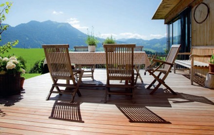 Jako okładzinę tarasu możemy wykorzystać gatunki iglaste, które są dużo trwalsze od liściastych. Sprawdzą się np. deski świerkowe, sosnowe czy modrzewiowe. Warto postawić też na zaimpregnowane lub zaolejowane deski dębowe lub jesionowe. Niestety decydując się na takie wykończenie, musimy liczyć się z koniecznością jego konserwacji co 2-3 lata. Bardziej wytrzymałe, twarde i odporne na zmienne warunki atmosferyczne jest drewno modyfikowane termicznie, czyli thermodrewno. Jednak najlepszym wyborem – niestety najdroższym – będzie drewno egzotyczne, np. tek, bangkirai, kempas, massaranduba, sapeli, cedr, eukapiptus. Co ważne, nie trzeba go ani wykańczać, ani impregnować. Deski układane na tarasie nie powinny być szersze niż 16 cm, a ich grubość wynosi 1,8--3,8 cm. Zastosujmy takie, które mają ryflowaną powierzchnię. Nie tylko woda będzie po nich szybciej spływała, ale także są bardziej odporne na odkształcenia oraz trudniej się na nich poślizgnąć. Desek tarasowych nie układamy bezpośrednio na płycie betonowej. Montaż drewnianej nawierzchni wymaga użycia legarów – podłużnych drewnianych belek. Legary ustawiamy co 30-60 cm na plastikowych klinach lub innego rodzaju podkładkach, dzięki czemu oddzielimy je od betonu i zapewnimy podłodze odpowiedni poziom oraz spadek. Deski do legarów mocujemy za pomocą wkrętów. Warto wybrać samonawiercające wkręty nierdzewne. Oczywiście przed montażem nawierzchni drewnianej płytę betonową należy zabezpieczyć hydroizolacją z papy lub masy bitumicznej. Niezbędne jest także pozostawienie między ścianą domu a deskami ok. 1-centymetrowej szczeliny.
