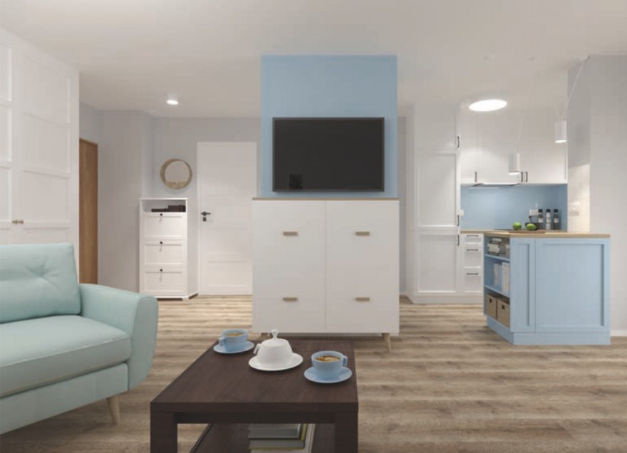 Obejmował on zmiany funkcjonalne i docelową aranżację wraz z zastosowanymi materiałami, sprzętami oraz kolorystyką. Wykonanie rysunków i planów poprzedziło wiele rozmów, w których wizje oraz marzenia właścicielki zderzyły się z fachową wiedzą i doświadczeniem projektantki. Indywidualny projekt zawsze jest też okazją do zrealizowania osobistych potrzeb inwestorów – w tym przypadku udało się uwzględnić wymarzoną przez właścicielkę wyspę kuchenną, a pamiątkowe meble z drewna egzotycznego oraz stare grafiki i ryciny zostały wpisane w nową aranżację w sposób wydobywający ich walory. W takiej współpracy trzeba jednak także umieć „ponosić straty”. W tym przypadku w efekcie rozmów część pomysłów inwestorki została odrzucona, np. zamiar pomalowania ścian całego mieszkania na niebiesko. Ograniczenie tego koloru jedynie do kilku elementów zdecydowanie bardziej podbiło urok ulubionej barwy. Wizualizacje były zwieńczeniem tego etapu współpracy. Możliwość zobaczenia swojego mieszkania w nowej odsłonie dodaje energii do dalszych działań i uzasadnia niezbędne koszty. Widząc efekt, łatwiej jest też pogodzić się np. z koniecznością wyrzucenia starych mebli czy innych sprzętów. To zarazem radosna perspektywa lepszego życia w nowoczesnym i uporządkowanym lokum.