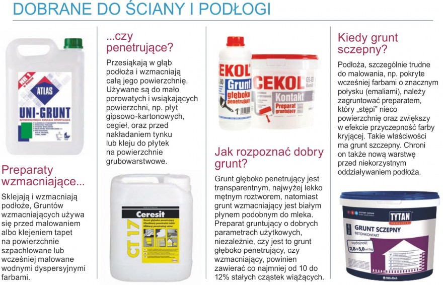 Zarówno preparaty gruntujące, jak i farby podkładowe mają wiele odmian. Zanim więc kupimy preparat, zapoznajmy się z opisami na etykietach. Co ważne, im bardziej zniszczona i wymagająca powierzchnia, tym silniejszych środków powinniśmy użyć. Pamiętajmy także, by zastosować środek przeznaczony do materiałów, na których będziemy pracować. Inny preparat nakładamy na beton, różne typy tynków, a inny na płyty gipsowo-kartonowe – informacje na ten temat znajdują się na opakowaniu. I chociaż na rynku dostępne są produkty uniwersalne, przeznaczone pod każdy materiał wykończeniowy, to preparat gruntujący warto także dobrać do rodzaju produktu, jakim będziemy ostatecznie wykańczać ściany. Jest to szczególnie ważne, gdy powierzchnie narażone są na przenoszenie zabrudzeń z warstw podłoża.